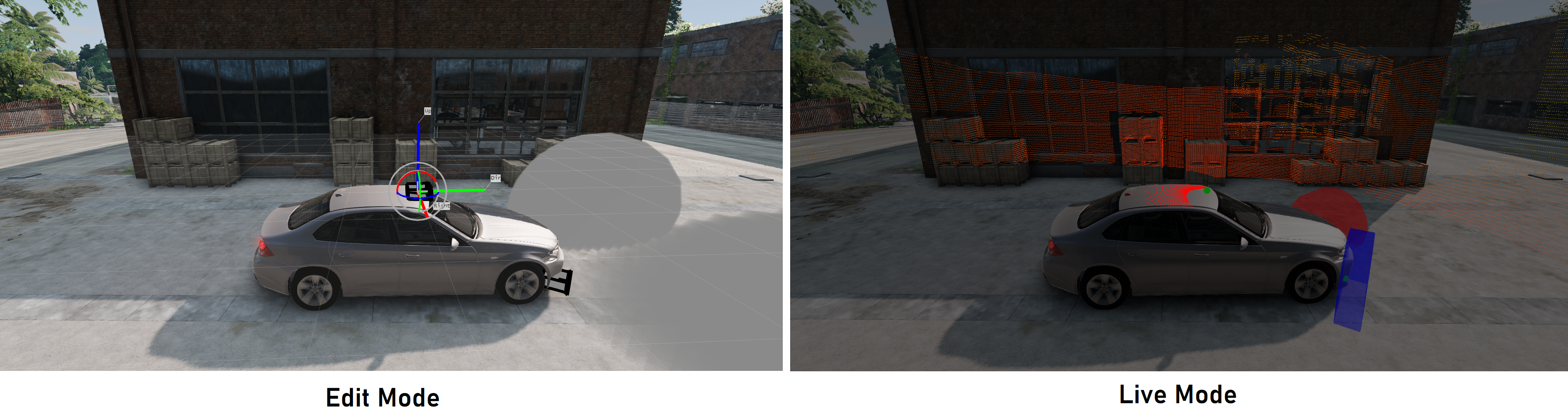 Live Mode is intended to give the user an idea of how the sensor will function when it is executed in a scenario. For example, suppose that a LiDAR sensor is attached then switched to Live Mode; the visualisation which then appears will indicate if the direction is correct or if part of its range is occluded by parts of the vehicle (this may be unwanted behaviour).