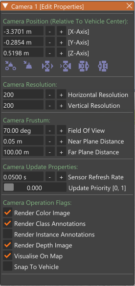 The Sensor Properties Window can be opened using the relevant icon beside the sensor. This allows the user to adjust all available properties of the sensor, such as update rates, beam shape, resolution etc - depending on the type of sensor. The window will appear slighly different for each sensor type. The image below shows the window which appears for Camera sensors.