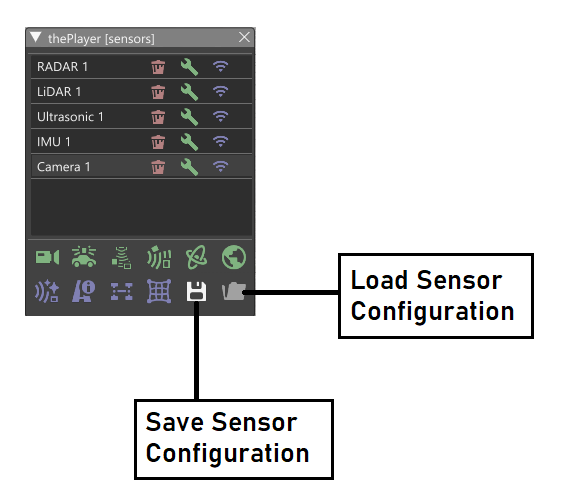 ADAS Sensor configurations can be saved and loaded from within the editor. These buttons can be found on the Attached Sensors Window for the vehicle which the user wishes to save/load.