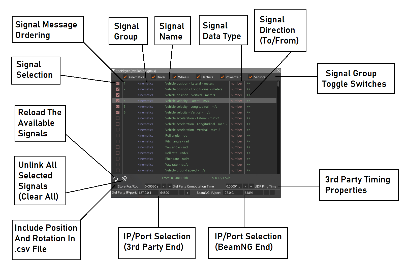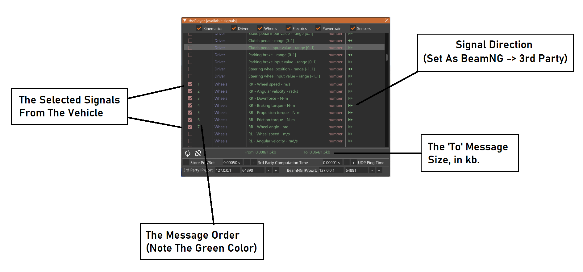 The user should use the Available Signals Window to build two messages. Signals are added to the message by ticking the box to the left of the property in the list. The direction arrow towards the right of list will determine the direction of travel for the signal (’to’ or ‘from’ BeamNG with respect to the third party).