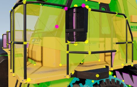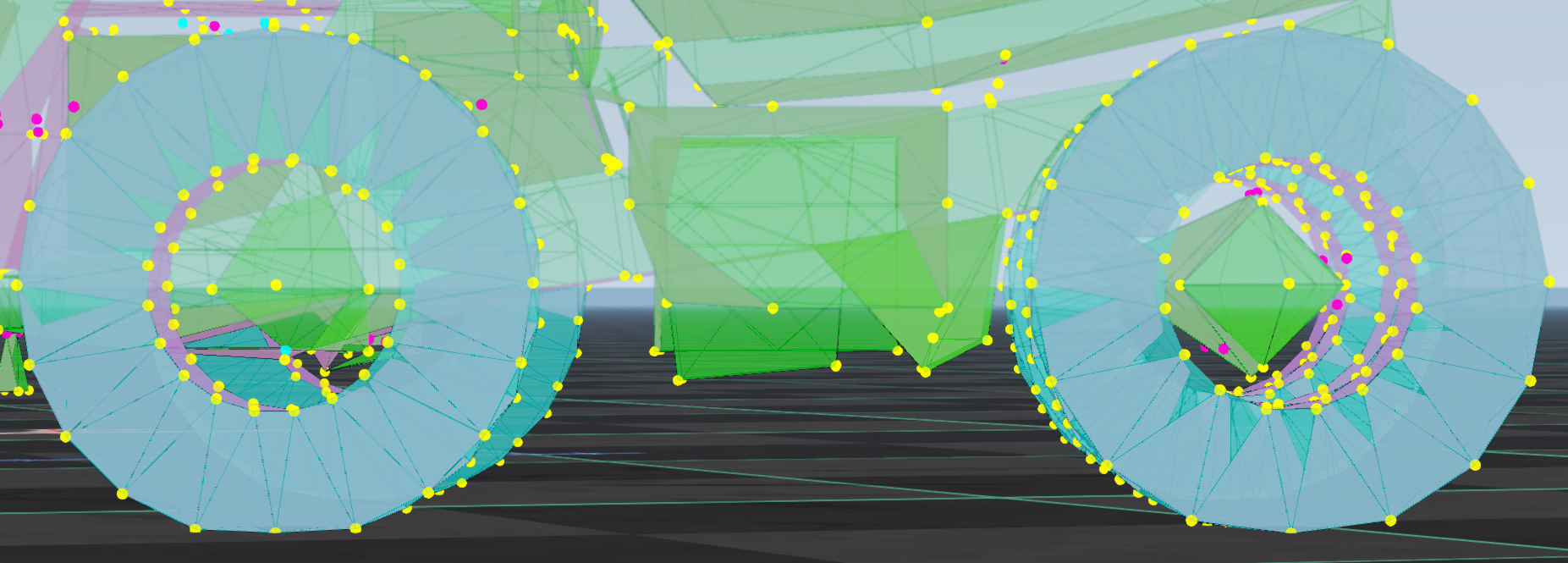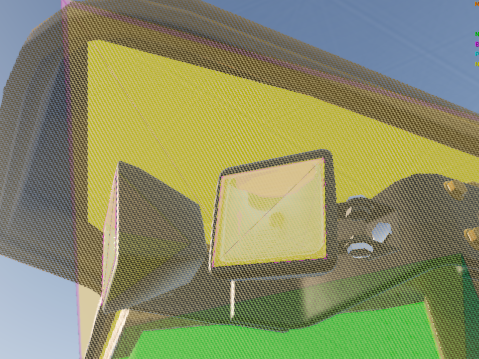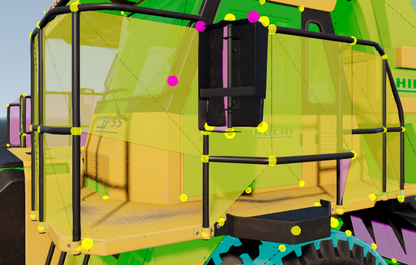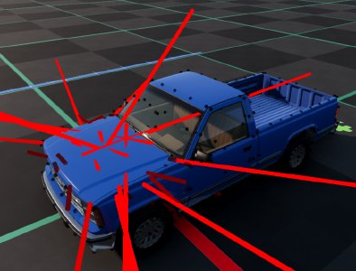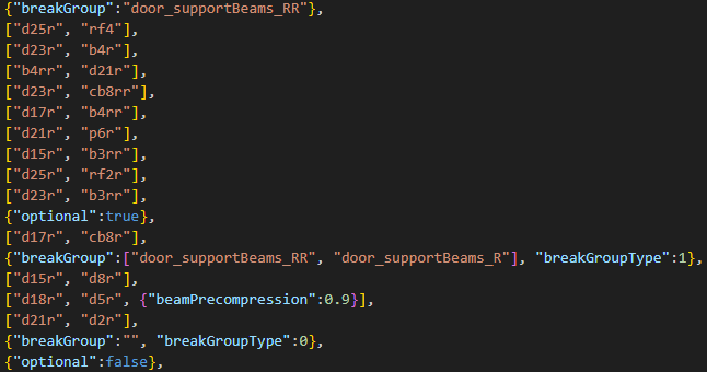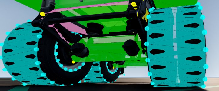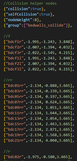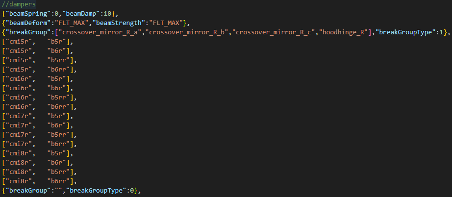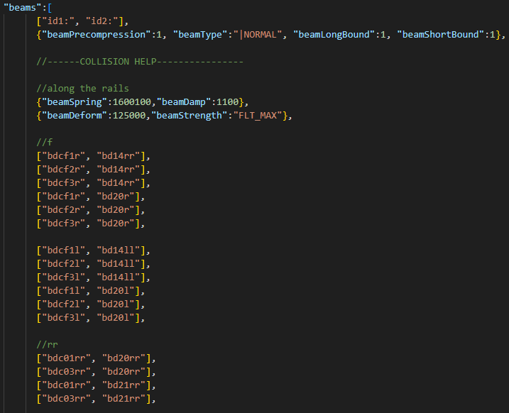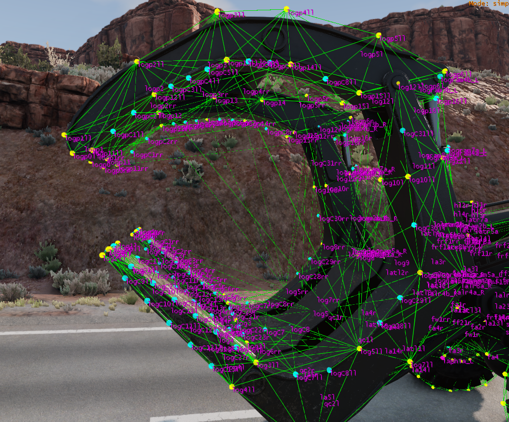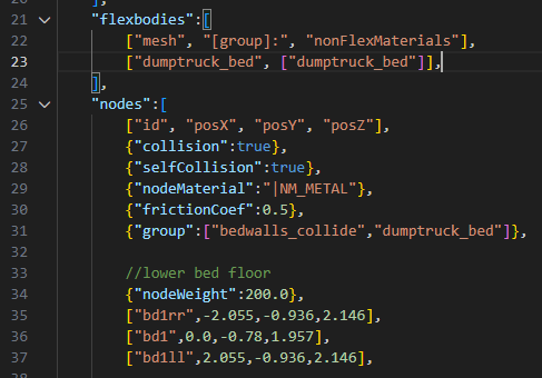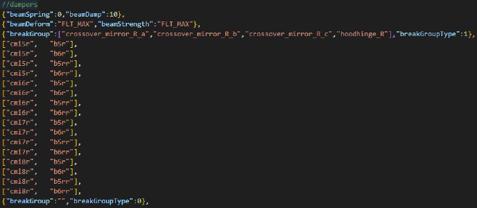 staticCollision parameter in Jbeam, which by default will be the same as collision parameter unless explicitly defined for a node.collision (inter-vehicle) and selfCollision (between parts of the same vehicle) in Jbeam.collision is false then selfCollision will be disabled even if set to true.fixed then collision and selfCollision are disabled but staticCollision can still be enabled.coupler then selfCollision is temporarily disabled on it while it’s coupled.SelfCollision won’t apply between a node and a triangle made of nodes with the same group as that node (in case of multiple groups it’s the first one). This can and should be abused if you want specific nodes and triangles to not collide but still generally want selfCollision there.externalCollisionBias parameter if you have clipping issues that can’t be fixed in other ways.NONCOLLIDABLE triangles still have anticlip, but are way better for performance.selfCollision has at least NONCOLLIDABLE triangles on the surface that can collide with things the easiest. This is why exhaust pipes have NONCOLLIDABLE triangles for example.BreakGroup can be a table, and with breakGroupType set to 1, it means the beam will break when either of the 2 breakGroups is triggered.