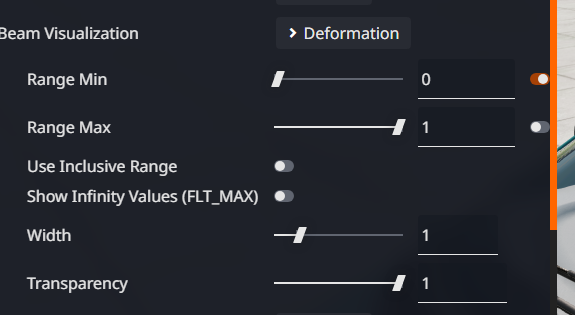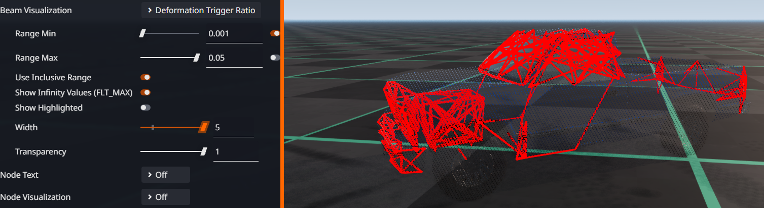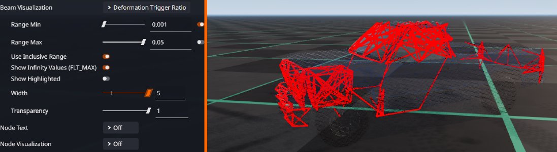 It is often useful to check for any beams that have deformed at all. To do this, in the Debug tab in the Vehicle Configurator: