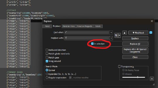When doing a batch rename/replace job in a Jbeam file, always make sure to limit it to the currently selected lines, to prevent messing up the syntax in Jbeam modifiers.
