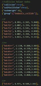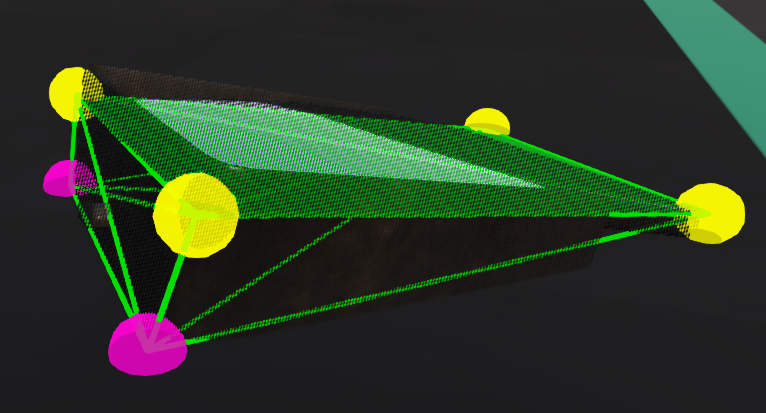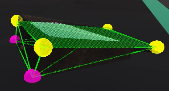 Some structures are too thick for flat plane Jbeam, but too thin to justify full three-dimensional dynamic collision for performance reasons (see Noncollidable Triangles above), for example flat rectangular mirrors on a truck. If you want them to have accurate collision with the ground but you are not concerned with dynamic collision, you can have some nodes with collision and selfCollision disabled, but staticCollision enabled, and no triangles going to them. This will help performance, especially if they are close to triangles of another part.